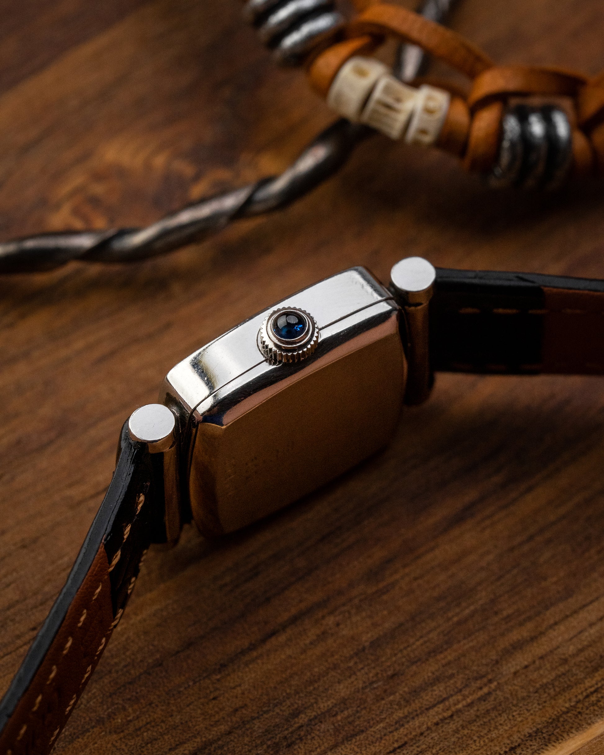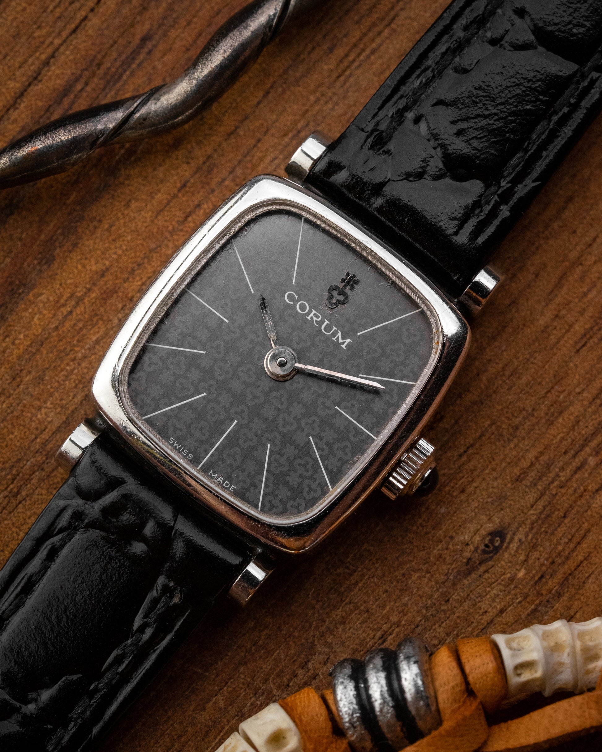 Presenting this petite and elegant ladies’ Corum from the 1970s, featuring a mineral glass that sits seamlessly flush with the case. Showcasing a refined grey monogram dial with minimalist stick hands, complemented by an oversized gem set crown - both practical and visually distinctive. Powered by a reliable ETA-based manual-winding caliber.