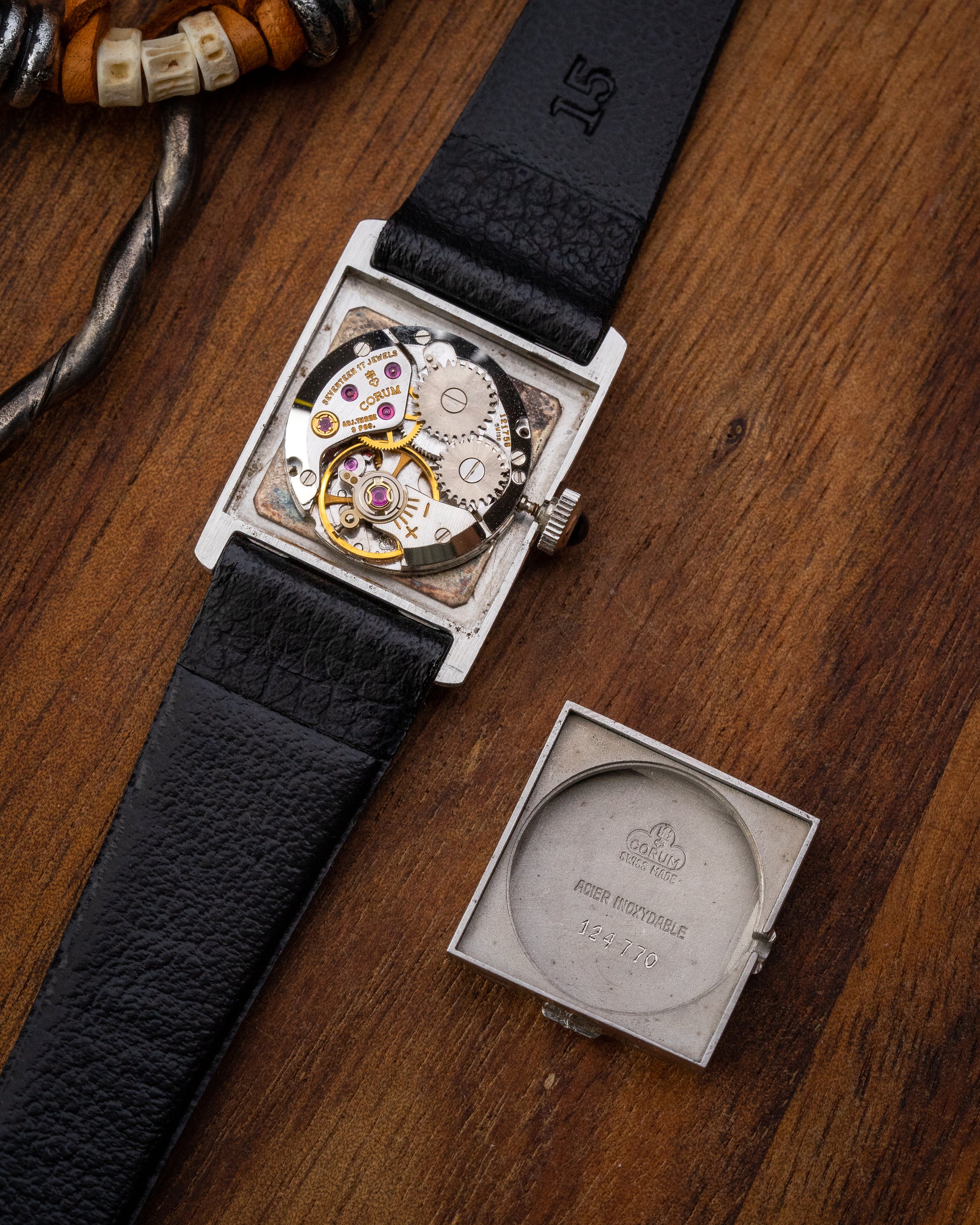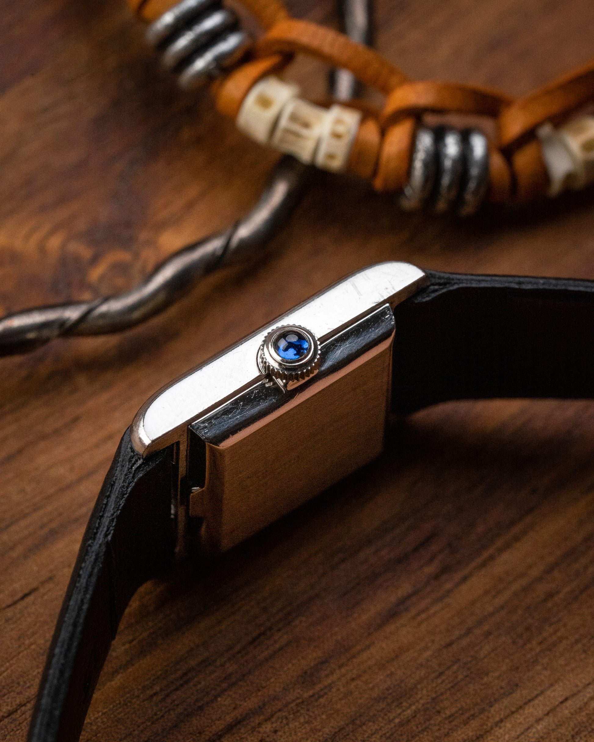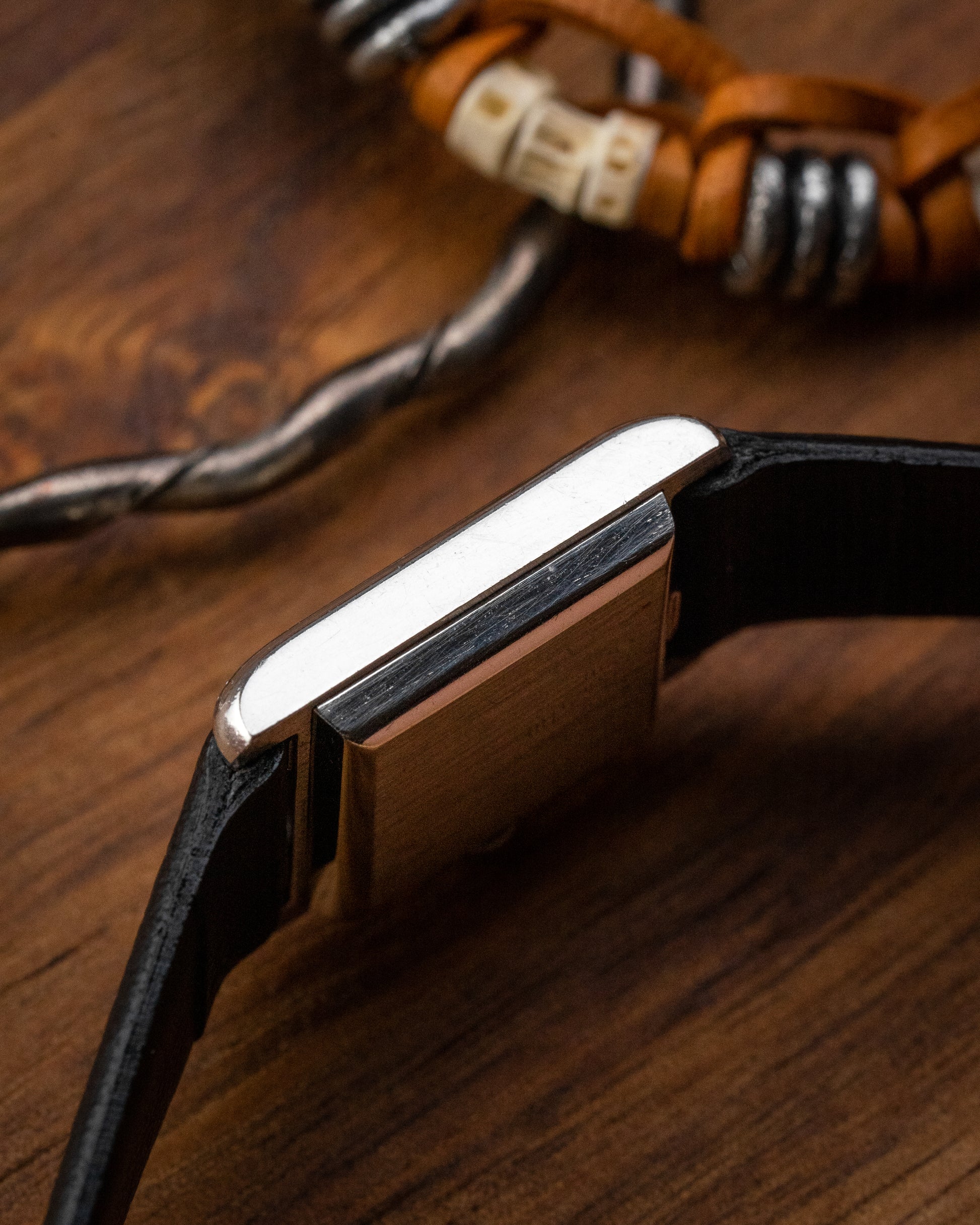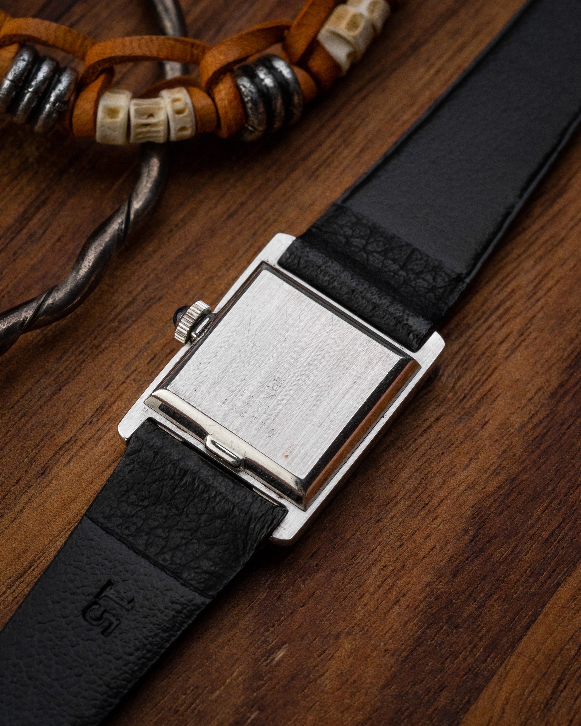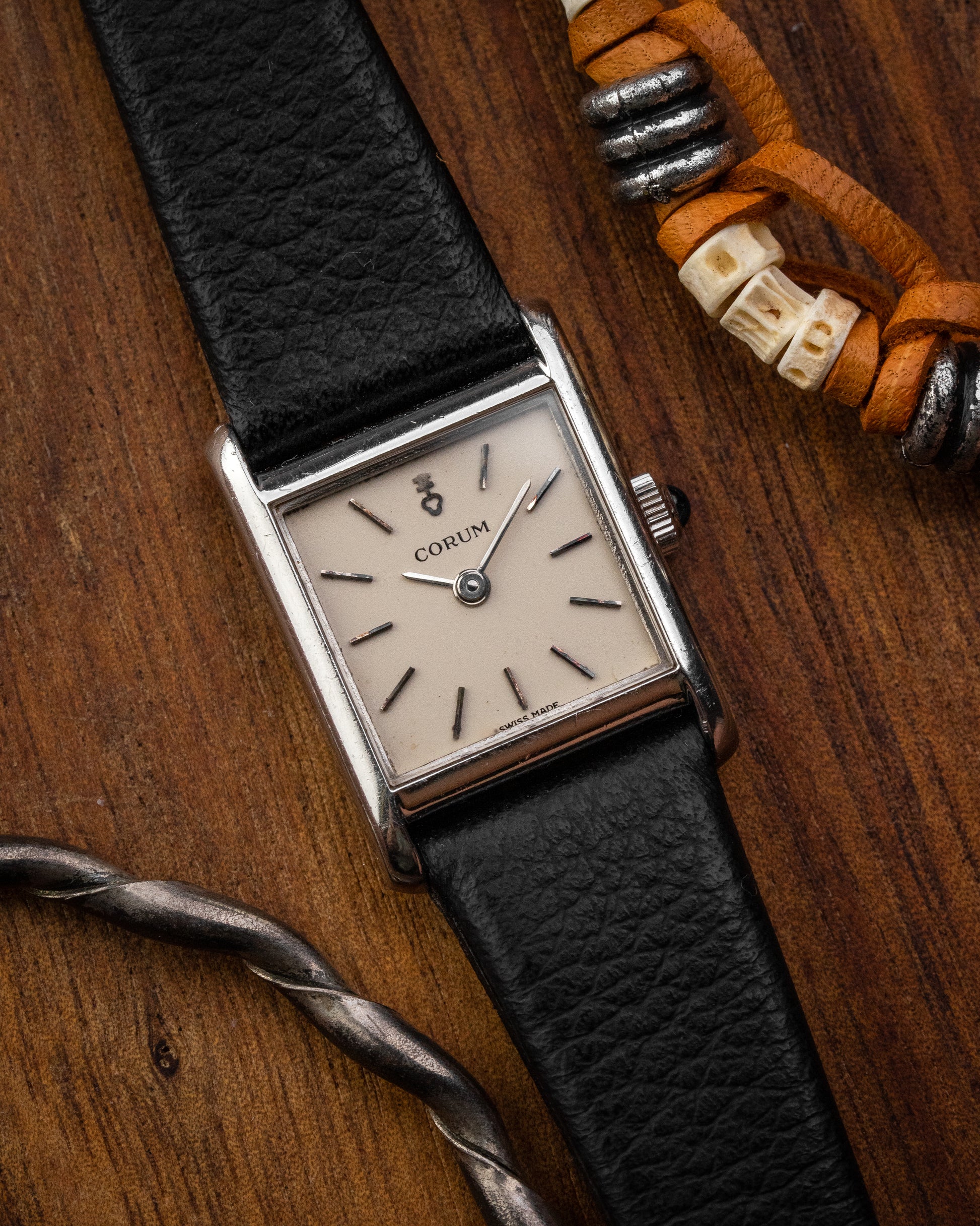 Presenting this small sized Corum whose silhouette closely mirrors the iconic Cartier Tank. From the softly rounded lugs that flow seamlessly from the case to the oversized gem set crown, it pays an elegant tribute to Cartier’s timeless design language. Feature here is a cream white dial with very gentle patina if you look closely, preserved in honest vintage condition. Inside beats a reliable manual winding ETA based caliber, the same movement found in certain vintage Must de Cartier reference. If you’re looking for a hand wound Tank style watch without paying Cartier prices, this is the perfect alternative. Originally designed for ladies, its proportions also suit gentlemen with a smaller wrist who appreciate understated vintage elegance.