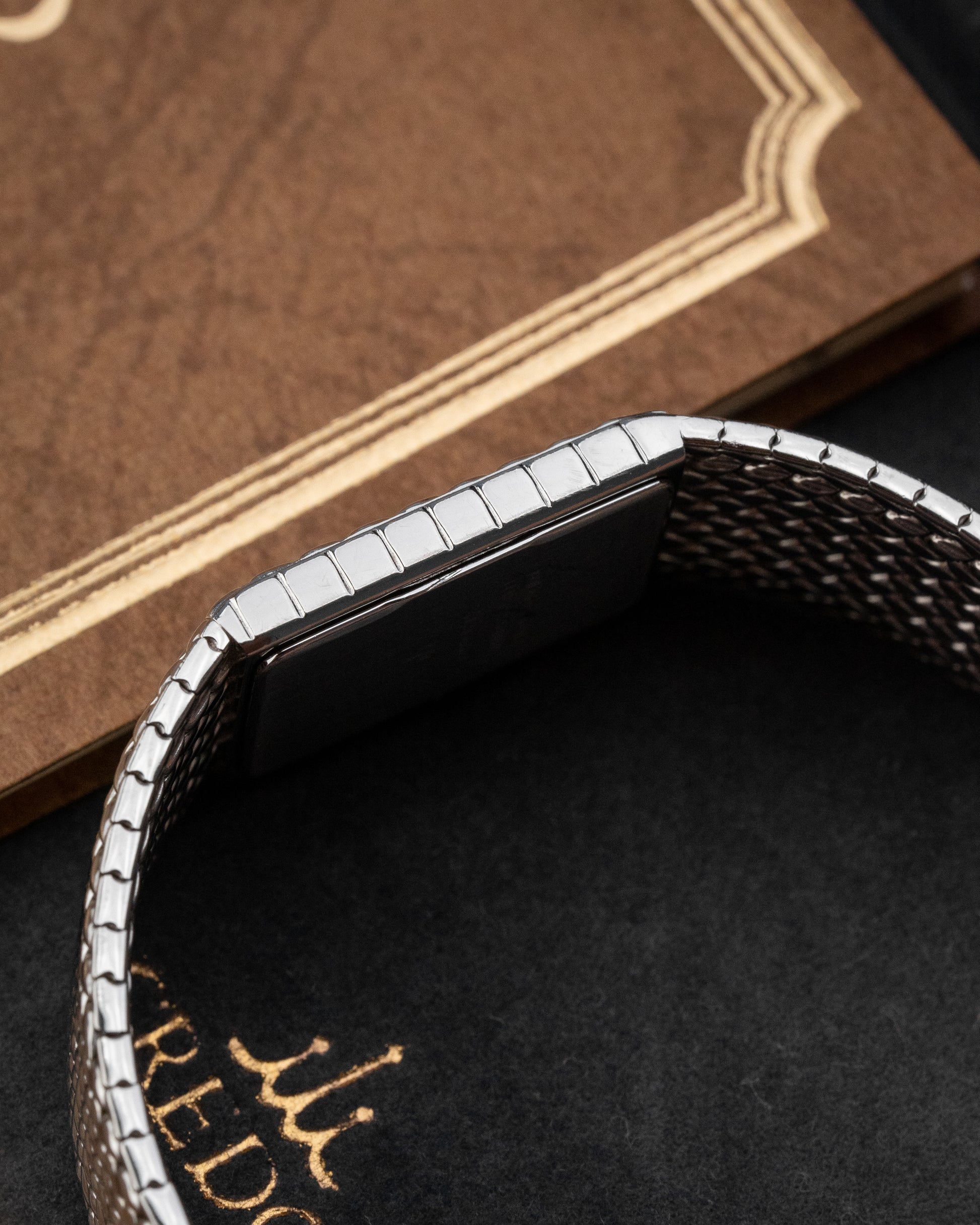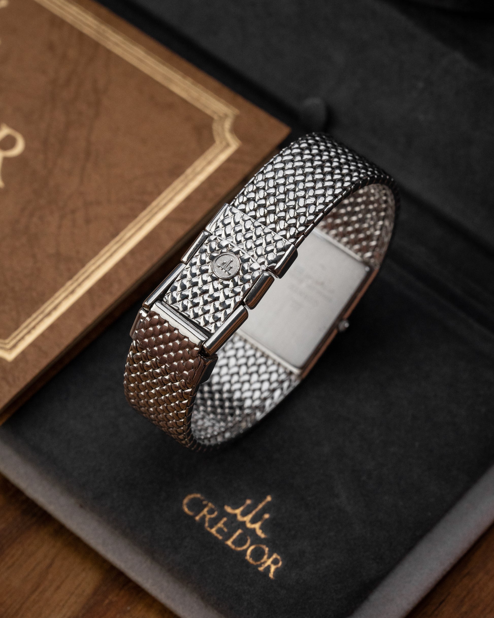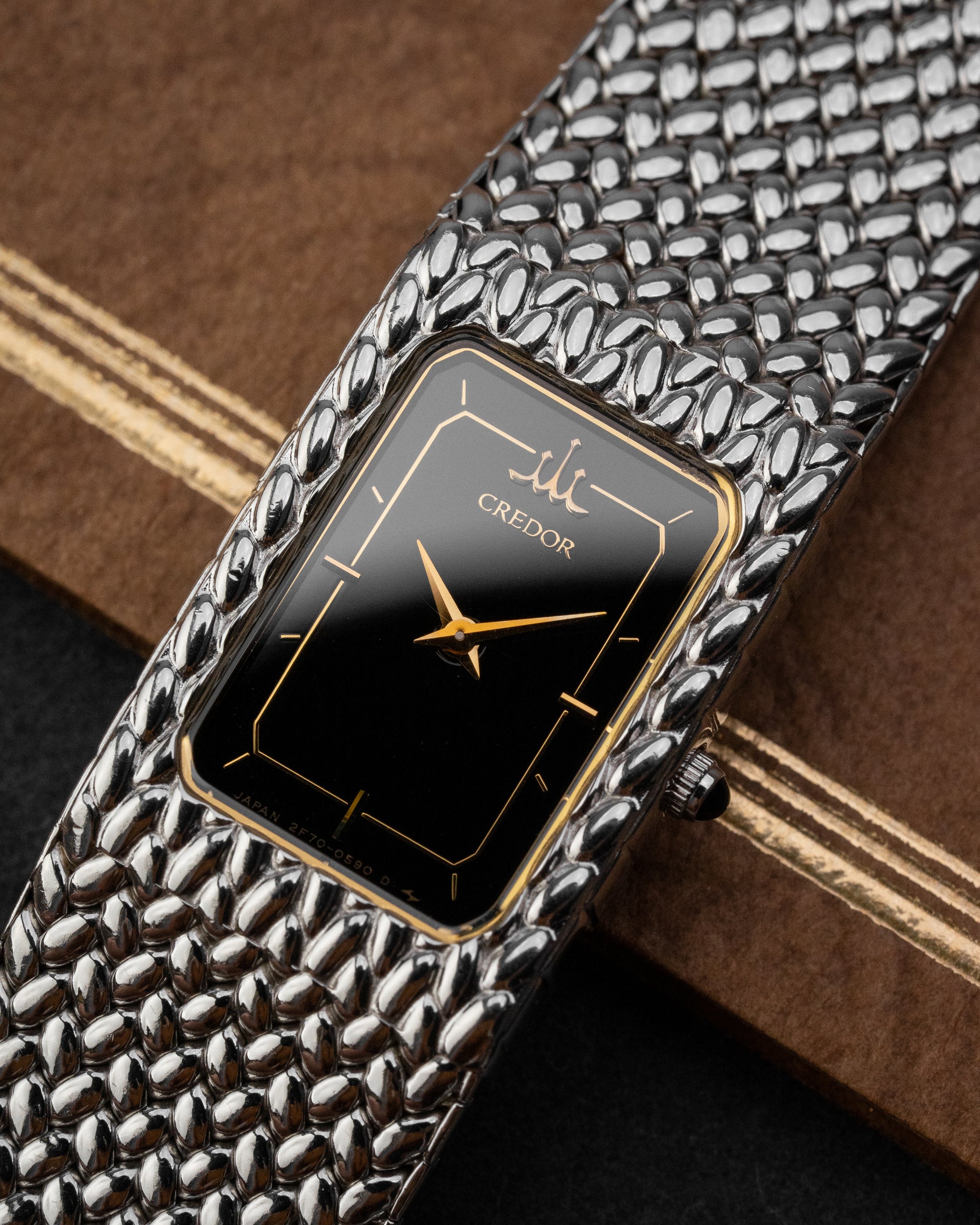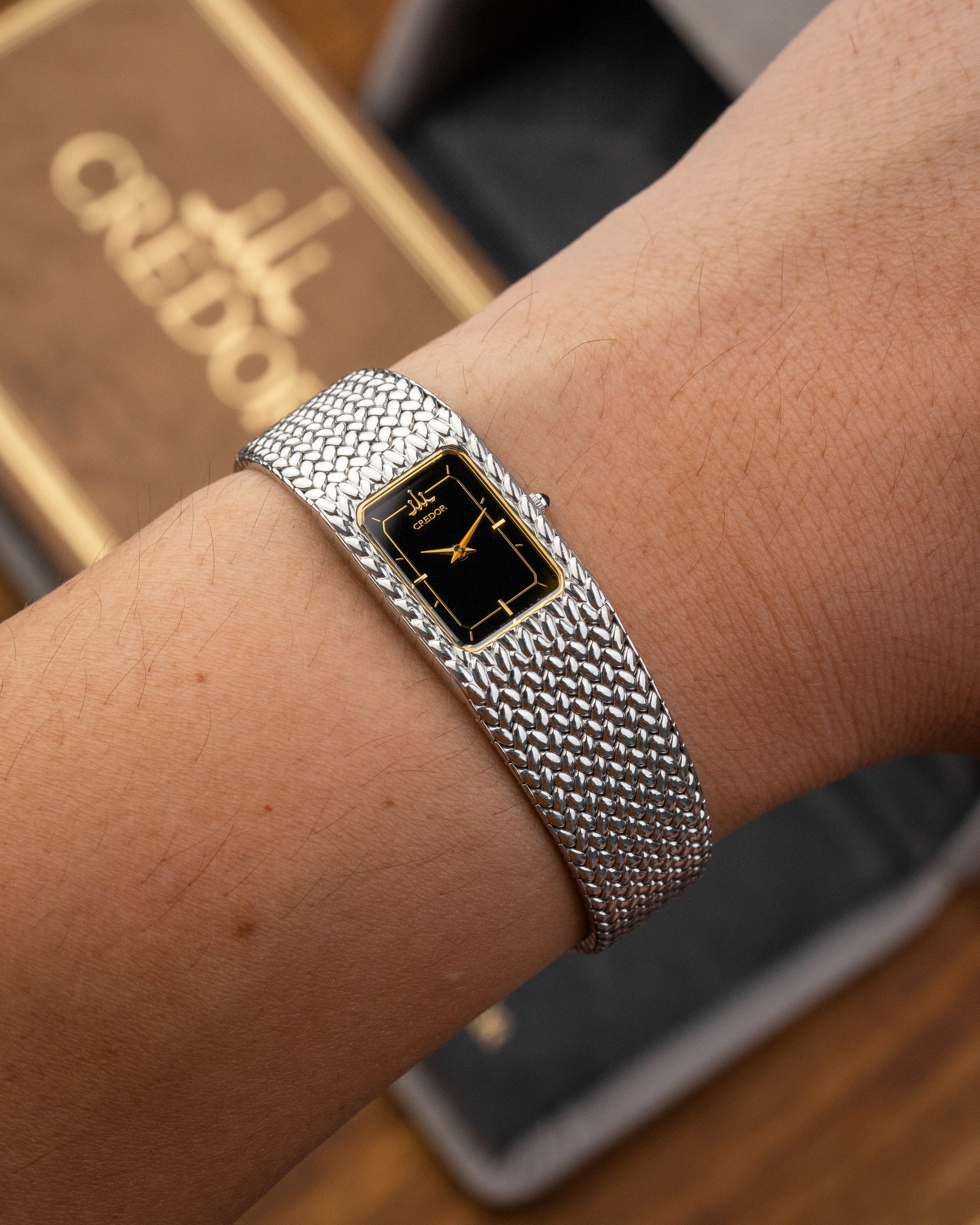 Presenting this rectangular case Credor with an integrated bracelet that flow seamlessly from the case. Housed a mesmerising glossy black dial with gold text and indices. With a flexible woven bracelet and a thin case profile, it wears comfortable on the wrist. Comes with its original box and paper.