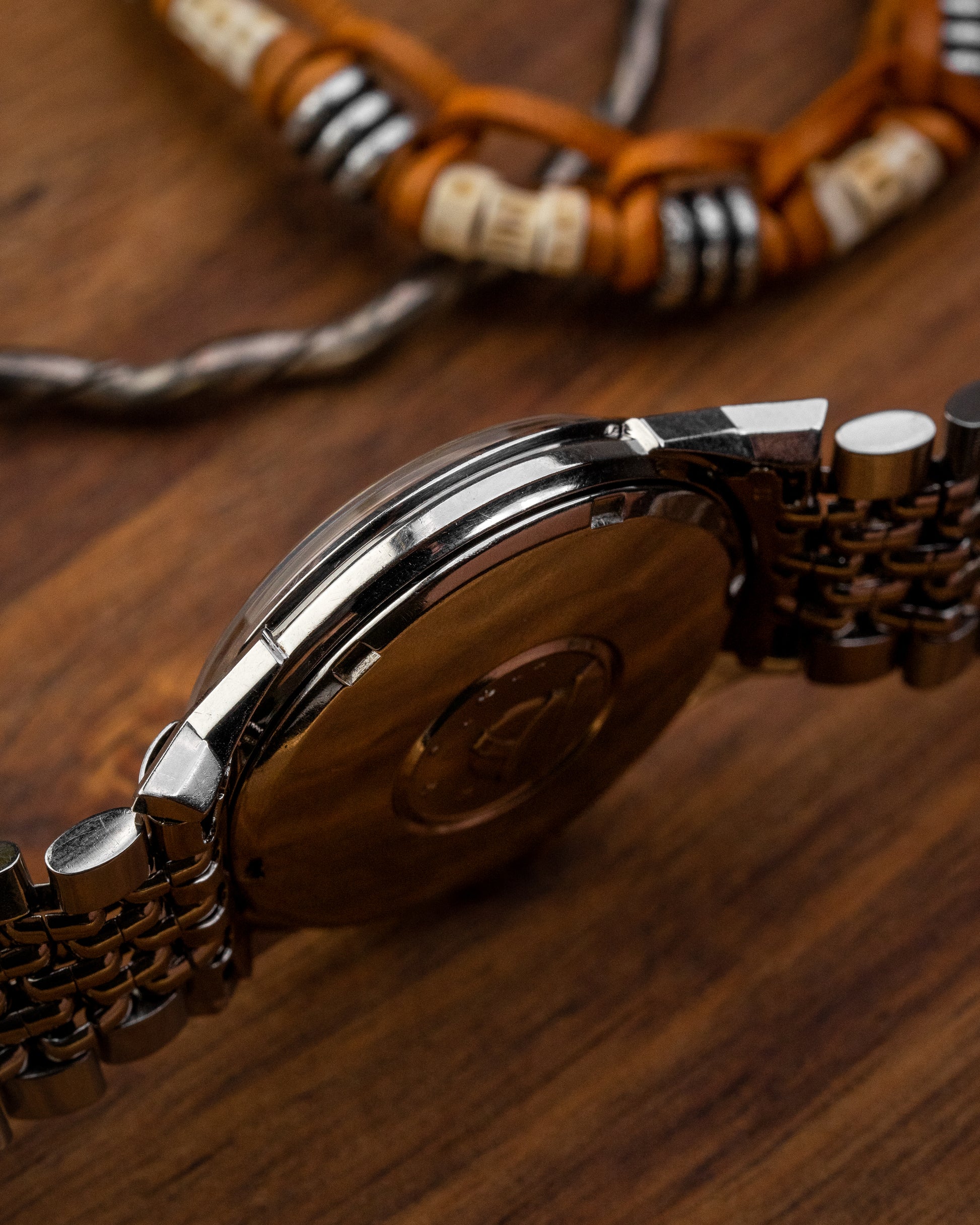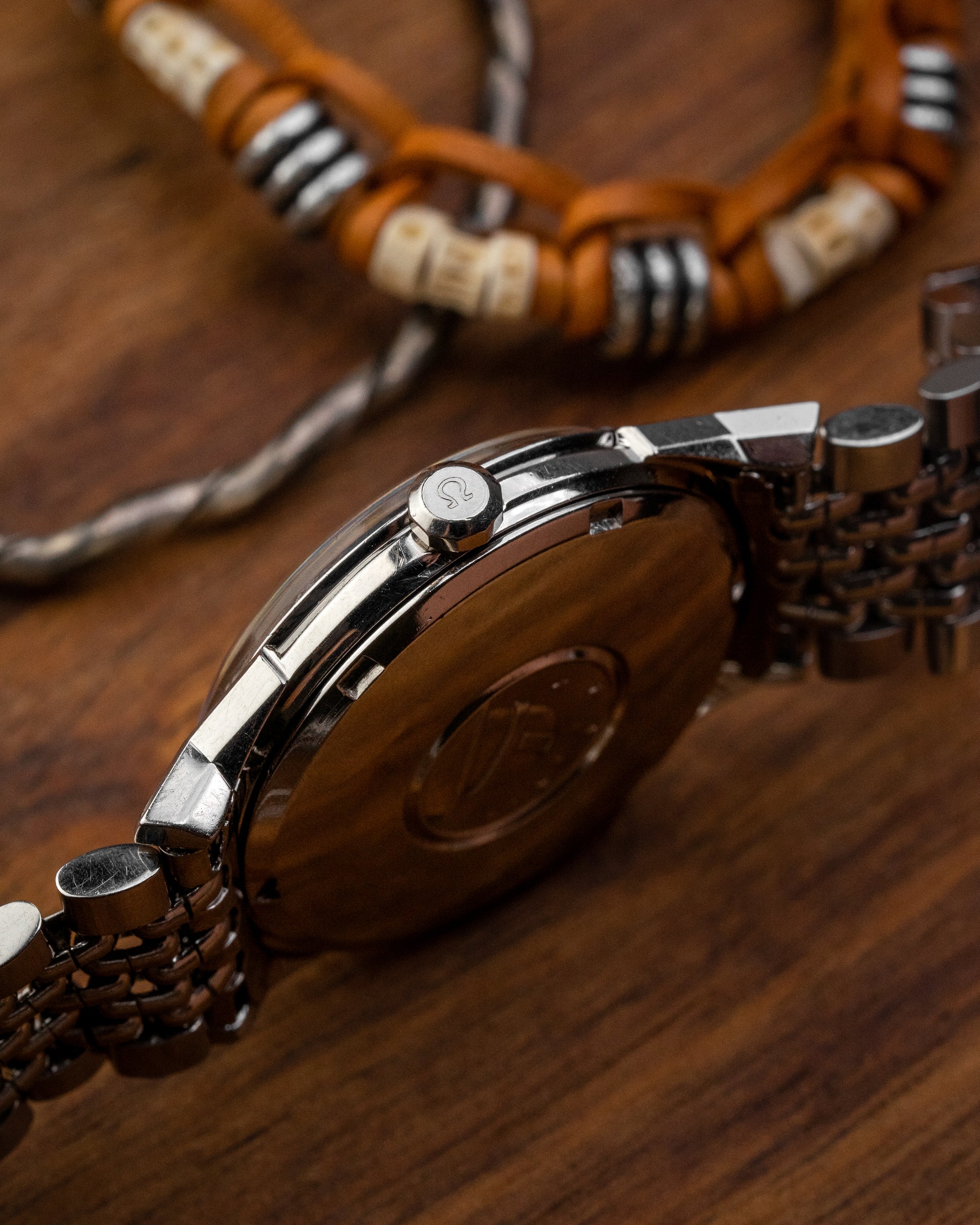 Presenting this Constellation from year 1963, nickname "Dog-Leg" over the years from collectors due to the distinctive kinked shape of the lugs. This example has applied hour markers in lume-less configuration. Rather than a "Pie-Pan" shape which the pre-C-shape case Constellations are known for, this flat dial curves down softly at the edges and benefits from a texture that changes character beautifully under different lighting angles. Movement has been fully serviced and ready to serve. Subtle purples tarnishing can be seen on the brass based caliber - it can be cleaned off but I always prefer to keep it as it adds character and a nod to its vintage charm. Comes with its original Beads of Rice bracelet.
