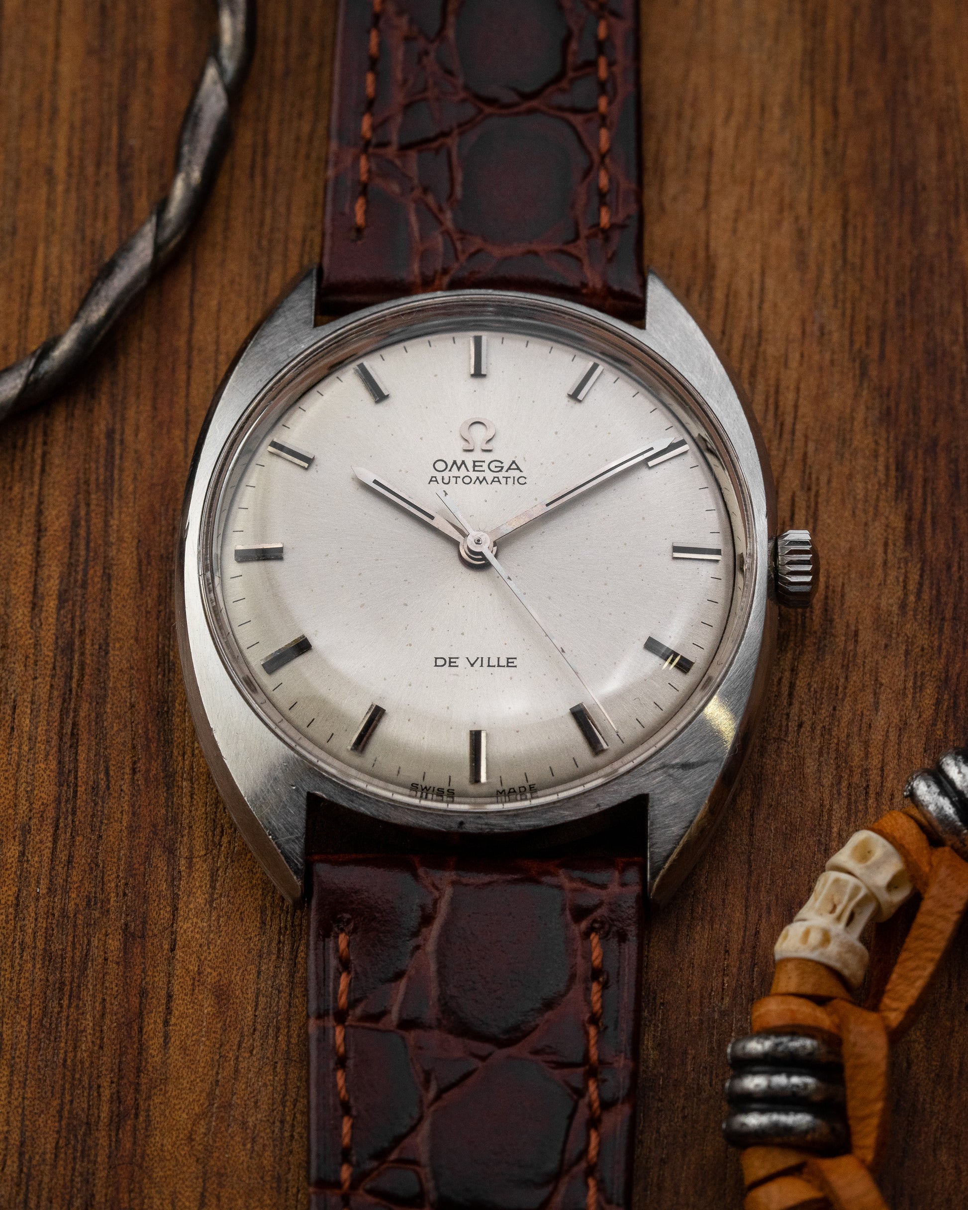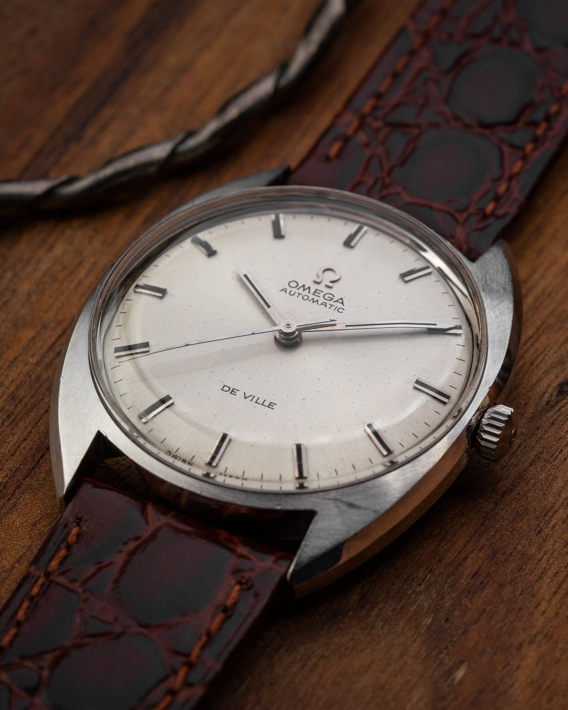 Presenting this De Ville from year 1967 with its distinctive C-shape case popularised by Gérald Genta. The case is in good condition, unpolished, and retains its original concentric brushed finish at the top. This piece showcases a dial adorned with a cream white sunburst finishing with slight honest bubbling patina. Powered by a reliable in-house time only automatic caliber in great condition.