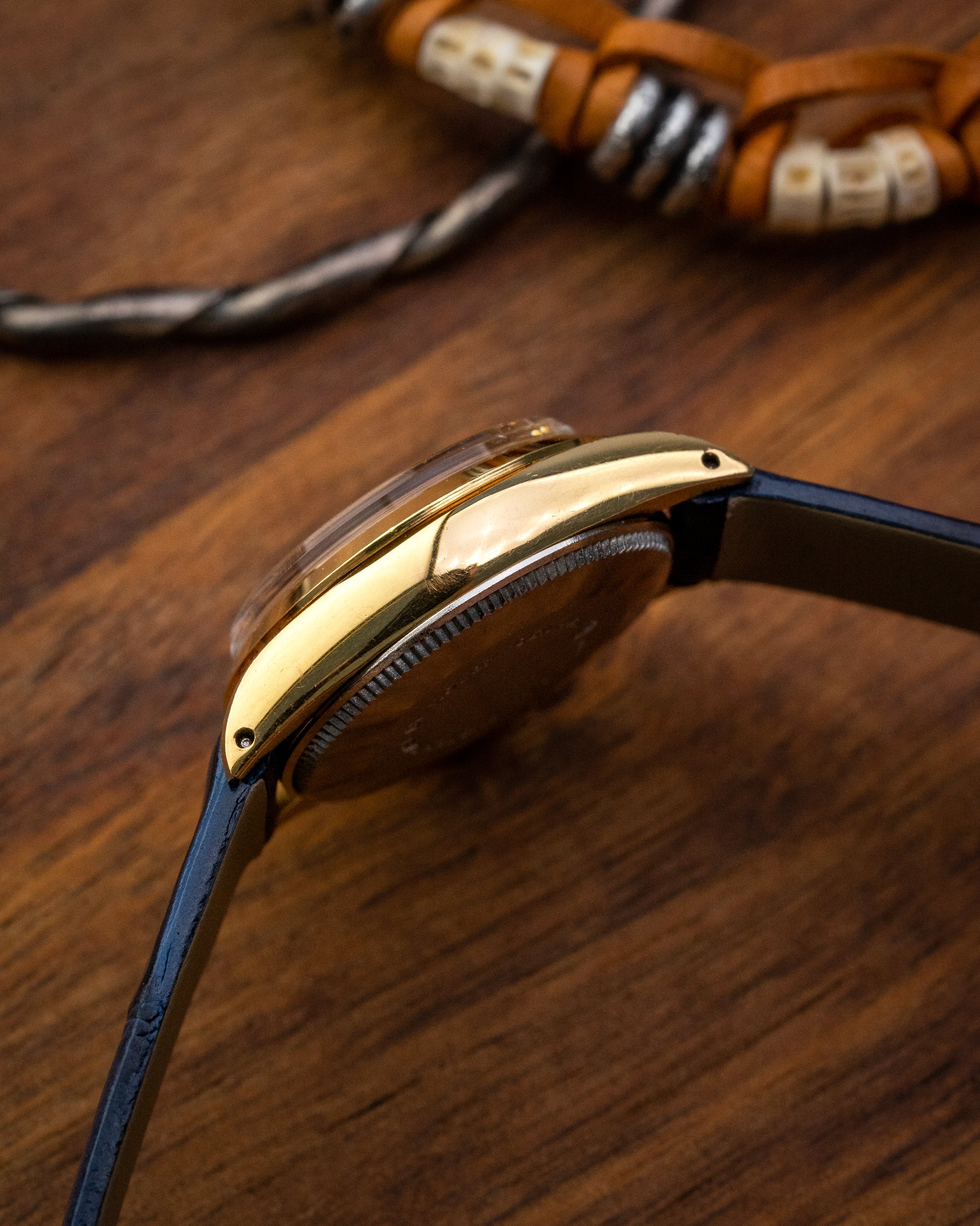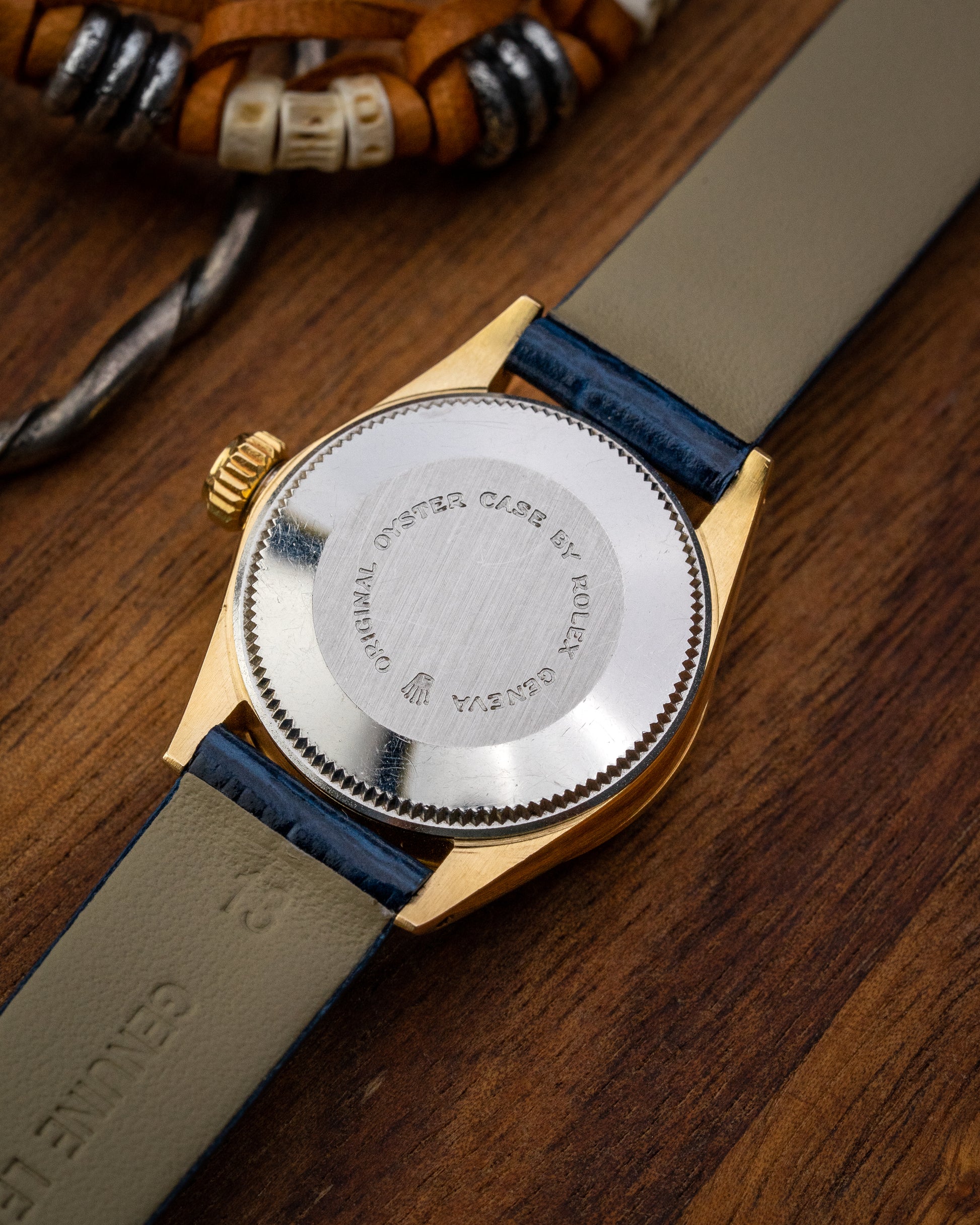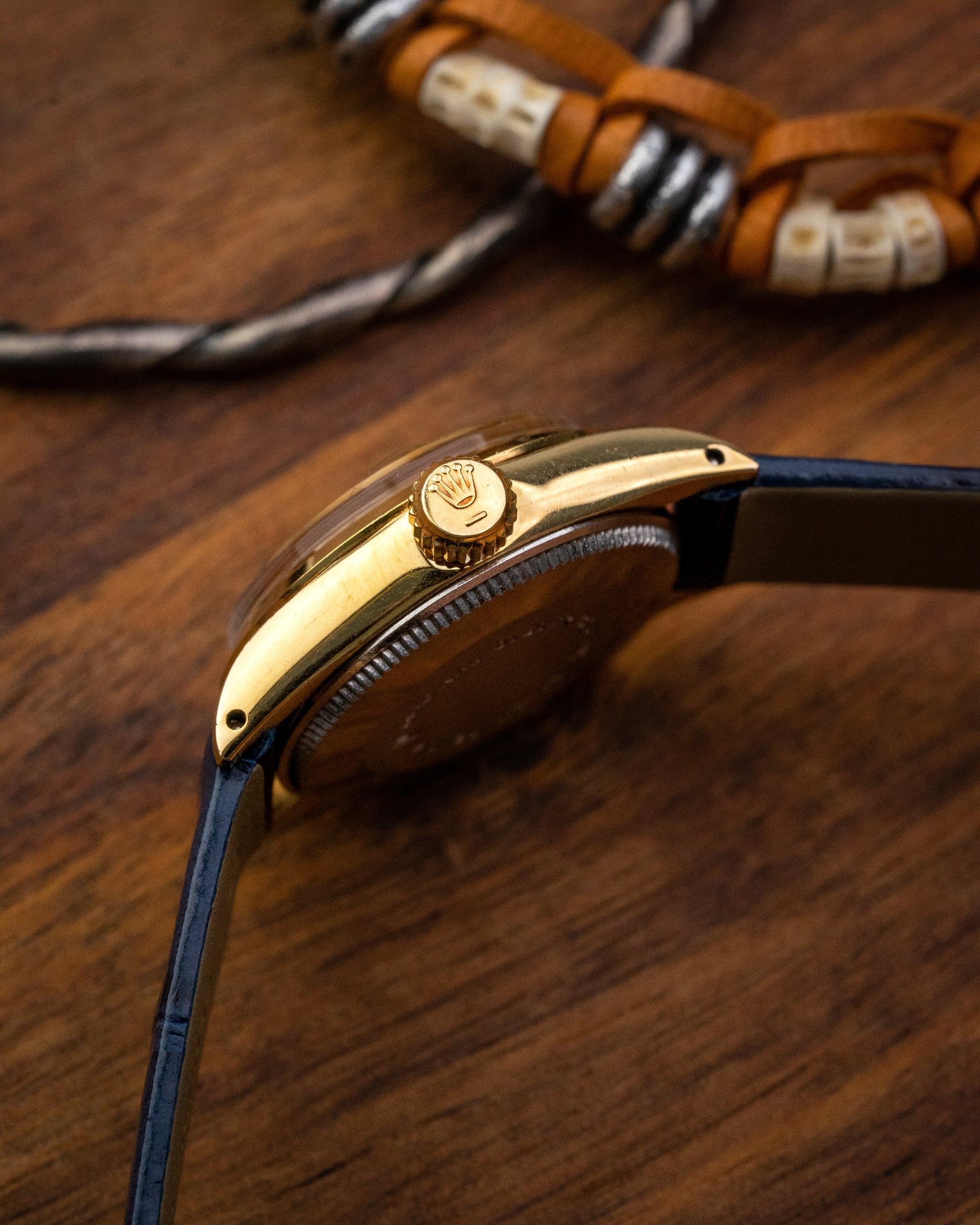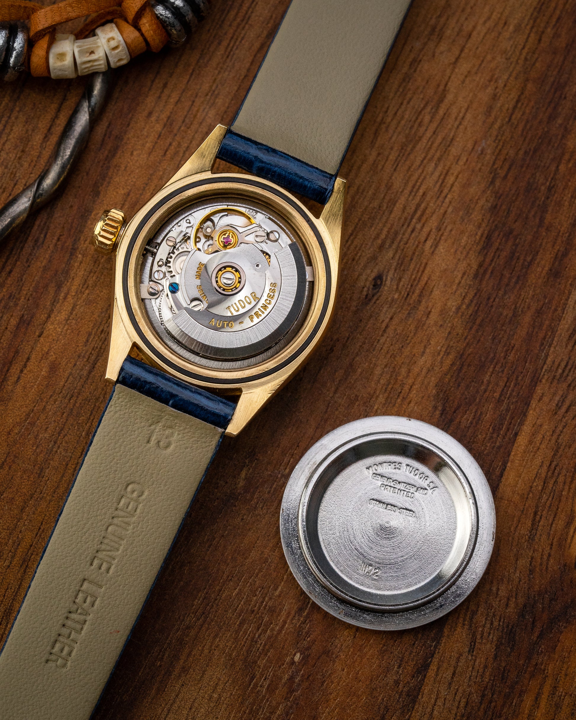Presenting this absolutely stunning Tudor Princess Oysterdate from 1973, housed in a yellow gold plated case that remains in exceptional unpolished condition, showcasing sharp edges and beautifully preserved factory finishing. It originally born with a blue dial that has gracefully aged into a charming lavender hue over the decades with marks can be around the center of the dial and indices. Capped with a plexiglass, complete with its signature cyclops magnifier over the date window. As some components were shared between Rolex and Tudor during that era, this piece retains its original Rolex signed crown and case back. House an automatic ETA based caliber, 3 hander with date. Originally designed for ladies as the "Princess" print on the dial suggested, its proportions also suit gentlemen with a smaller wrist who appreciate understated vintage elegance.