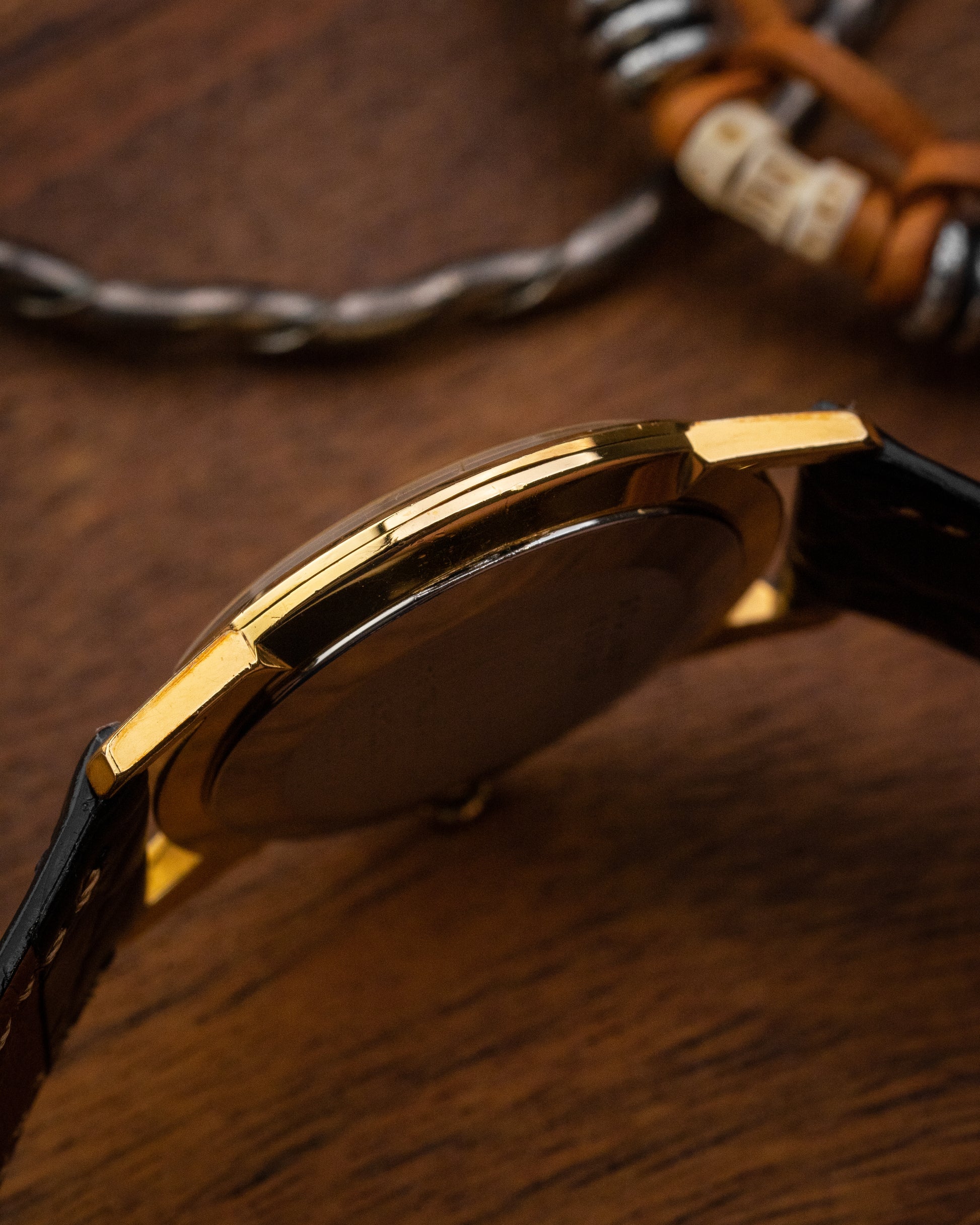 Showing here is a classic style Universal Genève with an uncommon champagne birch dial. A slightly larger reference compared to the commonly seen Ref. 542101. A minimalistic time only classic with stick hands keeps the aesthetic timeless. With its slim bezel and extended lug-to-lug profile, the watch wears noticeably larger on the wrist than its dimensions suggest.